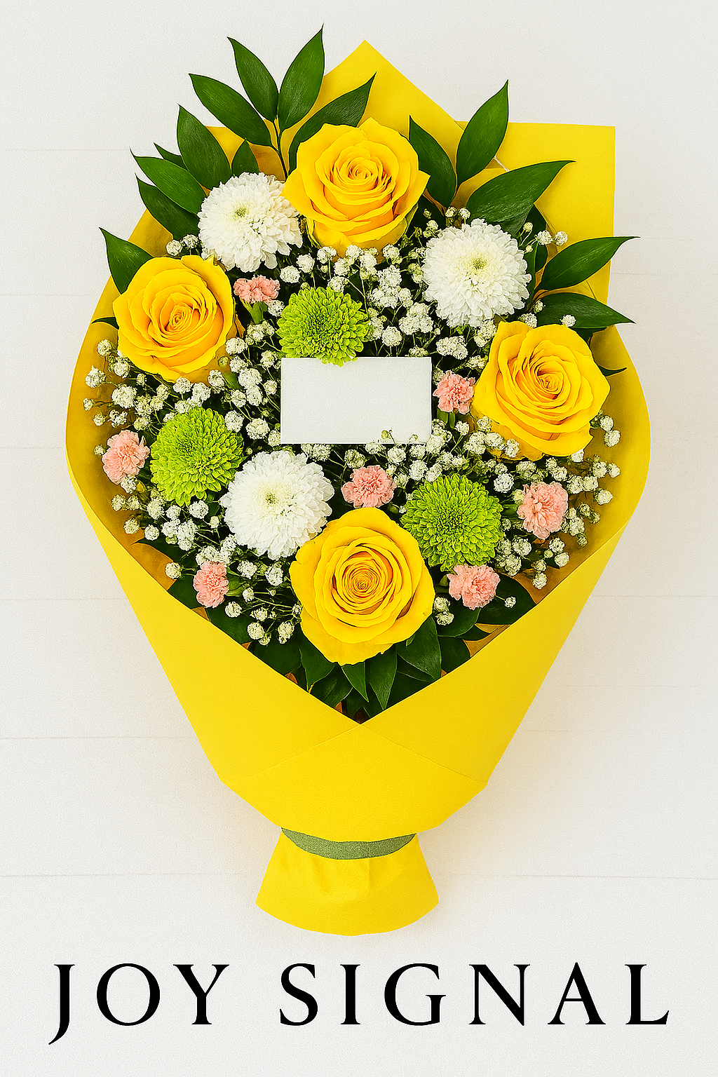 Bright yellow roses, lime green mums, and coral accents send a radiant message of celebration. Wrapped in vibrant yellow with a coral overlay, this bouquet is pure emotional sunshine. Perfect for: birthdays, congratulations, or spontaneous joy. Note: Each bouquet is intentionally wrapped to remain intact—no rearranging, no fuss. It stands upright in its own built-in water source, keeping the flowers fresh and vibrant. No vase required, no extra steps. Just unwrap the moment and let the recipient enjoy it as-is: beautiful, effortless, and ready to be received.