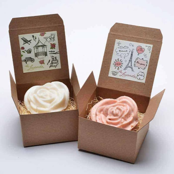 Incldues: 5 french soaps in gift box in various flavors, Pink heart guest soap, Rose French soap, Rose Bath Salt, and Deisgner thank you card with your verbage on it.